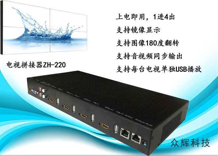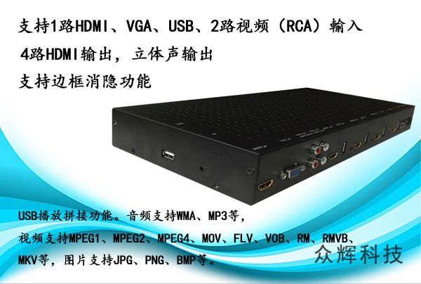 - 支持多路不同的視頻源,也可以U盤播放,無需外接矩陣分配器等,即可實現(xiàn)單臺2*2拼接,或者多臺級聯(lián)使用。
