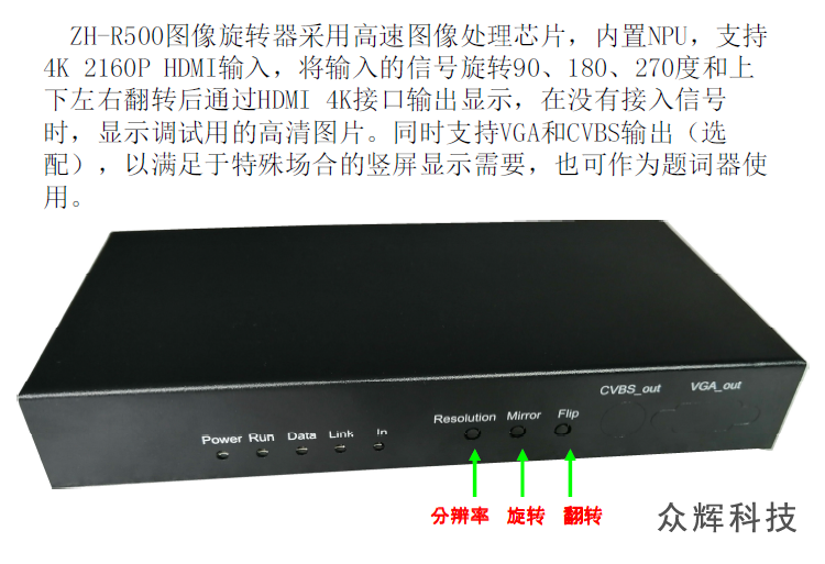 此款為ZH-R400的升級高端版本ZH-R500,此版本為全新發(fā)售,Linux嵌入式系統(tǒng),支持NPU,全按鍵操作,自動記憶,自帶測試底圖,沒有信號接入時也可以調(diào)試,輸入輸出分辨率可以設(shè)置為1080P和2160P。支持上下左右鏡像,可做為題詞器使用。彌補(bǔ)之前版本分辨率低,顯示文字不清楚的問題,如果對顯示要求不高,價絡(luò)敏感的用戶也可以選擇ZH-R100 如果輸入不要求4K,可能選擇1080P輸入的ZH-R400,如果喜歡安卓系統(tǒng)可以選擇ZH-R300。